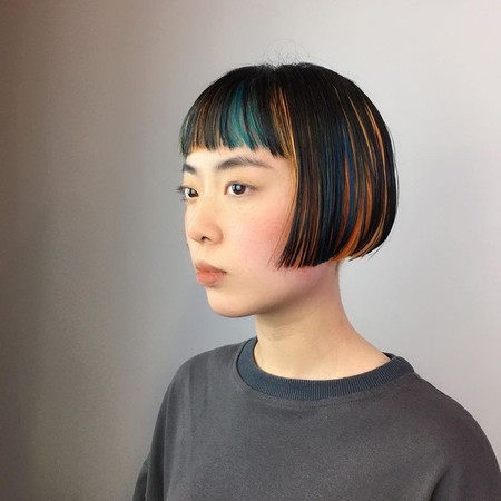 这款皆由中彩度颜色组合,分别为宝石绿、大地褐黄色、低彩度矿石蓝,搭配浏海BOB短发,主要将宝石绿挑染点缀在浏海中、侧面搭配较为亮眼的褐黄色来让脸部轮廓线条较为柔和,烟花染的入门首选。