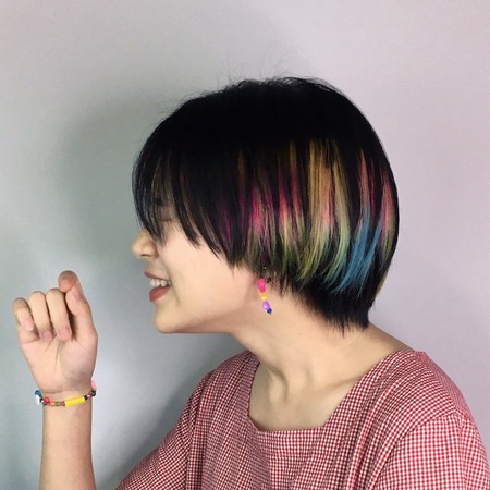 如果对颜色没特别想法,冷、暖色系都不排斥的话,不妨试试这款缤纷霓虹调,这款挑染区块是从耳上延伸至后头部,从红橙黄绿蓝紫通通来一笔,既和谐又渐层,任何短发造型搭配这样的缤纷组合其实都非常适合,推荐给喜欢与众不同的你。