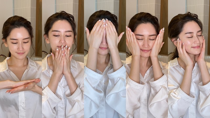 Step3.掌心于两颊由下巴至太阳穴,做出压弹的动作,增进肌肤弹力,使肌肤澎润透亮
