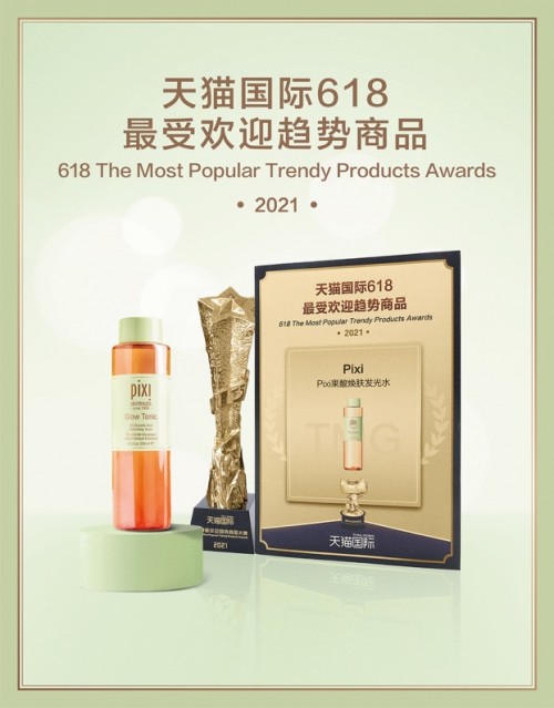 天猫国际作为Pixi中国的官方电商销售平台,亦是在中国广受认可的国际品牌官方产品售卖平台。618最受欢迎趋势大奖由天猫国际618大促活动间销售数据统计而得,综合护肤品类产品售卖趋势而评选出的奖项,由数据支撑此次评选,从天猫国际九大行业中选取排名前200名的商家,共计1800名商家作为评选底池,经过挑选后筛选出10名商家入围“天猫国际618榜单商品大赏”提名,最终经过天猫国际市场部全面审核,确定Pixi 旗下商品“Pixi果酸焕肤发光水”作为天猫国际美妆护肤类目趋势商品代表,同其他三位品牌一同收获“天猫国际618最受欢迎趋势商品大赏“,让Pixi在中国的闪耀之路更上一层楼。