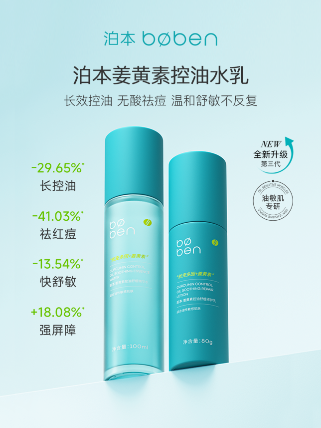 马上到了油敏肌最难熬的夏季,在炎热潮湿的气候中,油敏肌不仅非常容易过度出油,而且出油的区域还常常因为屏障储水保湿能力差变得特别干燥,从而极易引起泛红刺痛等敏感不适的情况。所以对于油敏肌来说,修护皮肤屏障与控油一样重要。泊本以其卓越的产品品质和科学的配比方案,针对油敏肌存在的一系列皮肤问题专研的姜黄素水乳,通过温和舒敏修护,来解决水油失衡、外油内干、刺痒泛红等复合皮肤问题。