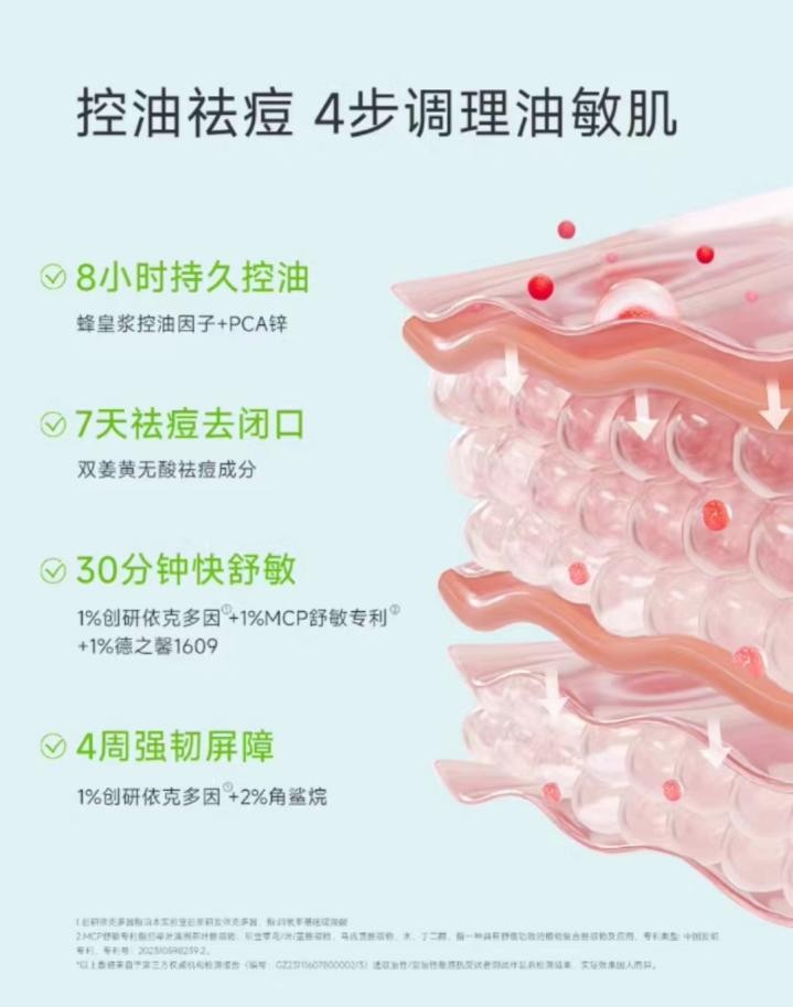 经第三方权威测试,姜黄素控油水乳能够实现长效控油,8小时油脂含量-29.65%;温和祛痘:7天痘痘面积-41.03%;即时舒敏,30分钟面部红区-13.54%;修护屏障,28天经皮失水-18.08%。这不仅为油敏肌提供了更加合适的护肤品,而且还受到了皮肤学专家团的专业认可。
