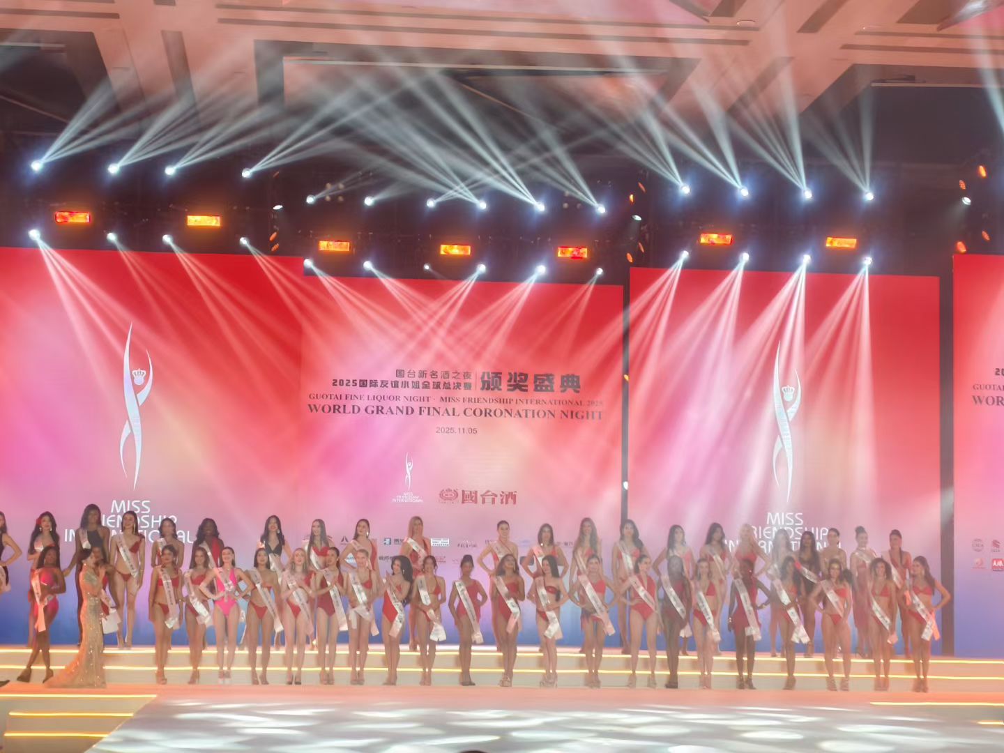 11月5日晚,全球青年文化交流活动·国台新名酒之夜2025国际友谊小姐全球总决赛颁奖盛典在贵阳国际生态会议中心举行。来自全球60多个国家和地区佳丽身着特色民族服饰依次登场,为总决赛拉开华丽序幕。在持续两小时的角逐中,选手们通过民族服饰、才艺、比基尼、晚礼服及问答等评比环节,尽显自信台步、健美体态与独特气质,释放出全球青年多元而蓬勃的活力。
